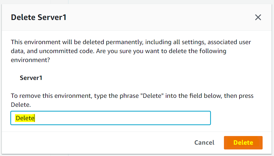 정말로 지우겠는지 묻는 창이 나온다. 텍스트 입력창에 Delete를 적어주고 Delete 버튼을 주르면 삭제가 완료된다.