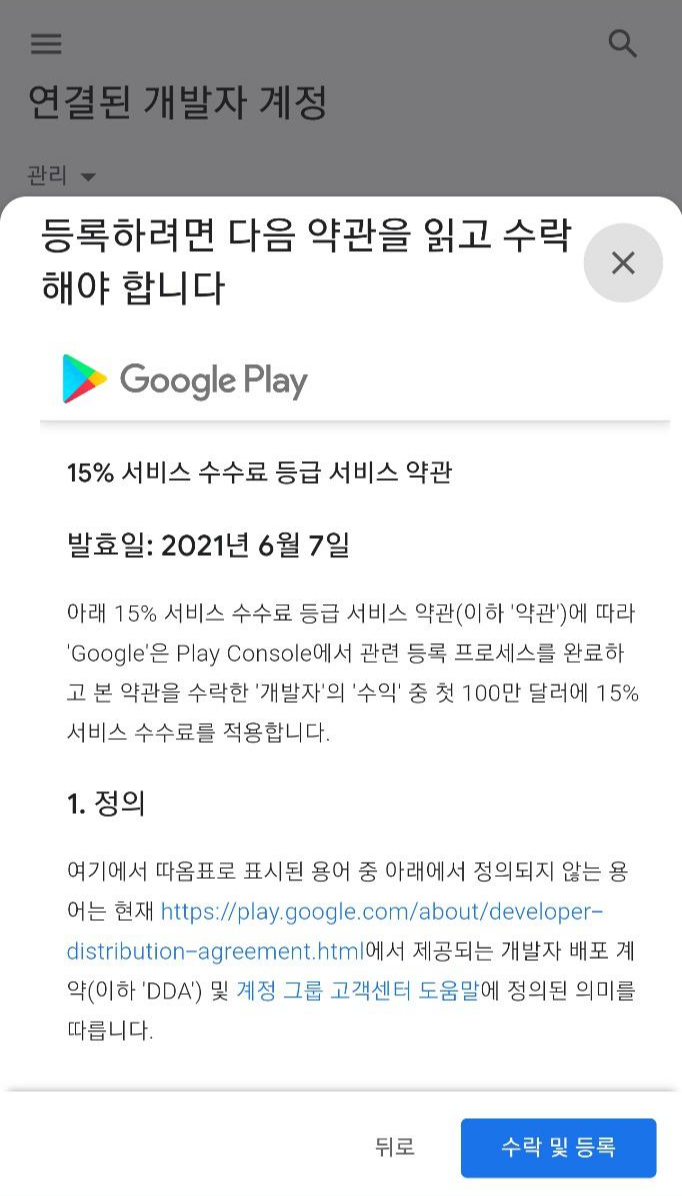 계속해서 15% 서비스 수수료 프로그램에 등록하자. 등록될 계정 그룹에 방금 전에 설정한 나의 개발자 계정이 뜰 것이다. 약관 확인 및 동의 파란색 버튼을 누르고, 약관 페이지에서 수락 및 등록 파란색 버튼을 눌러 등록은 완료한다.
