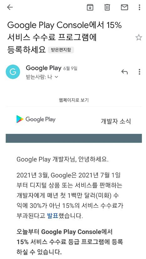 Play console에 로그인하고 메시지함을 확인해보자. 15% 서비스 수수료 프로그램에 등록하라는 알림이 와 있을 것이다.