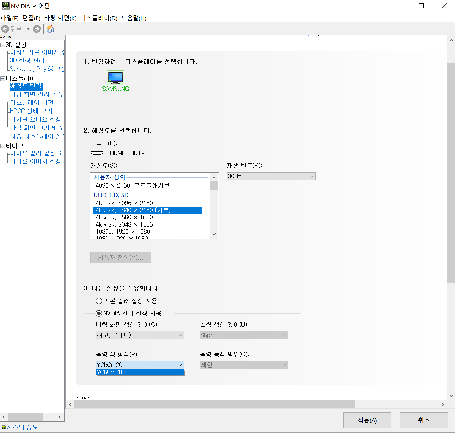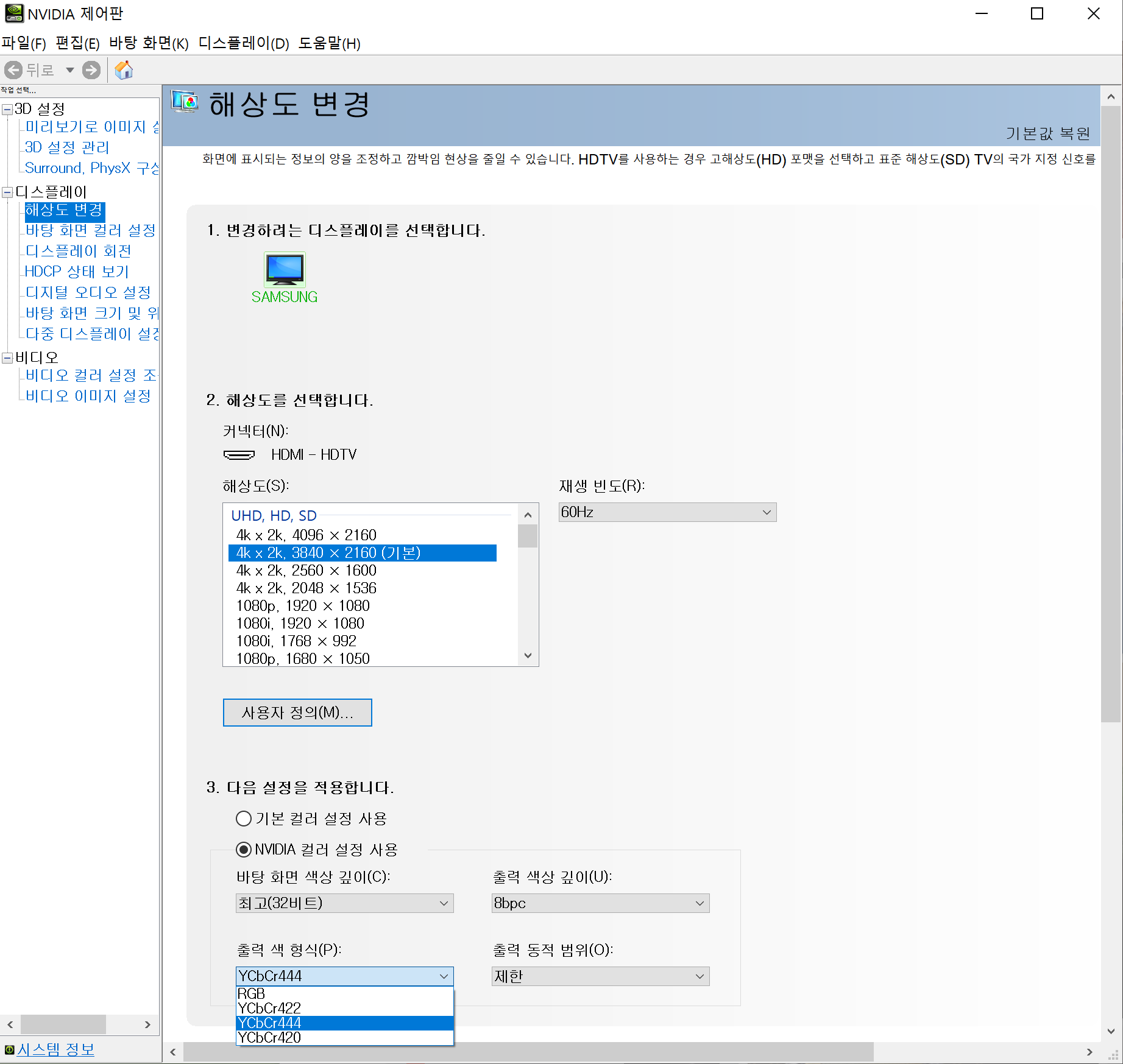 삼성 QLED TV를 PC 모니터로 사용하기 위해 PC와 HDMI 캐이블로 연결했습니다. 그리고 NVIDIA 제어판의 해상도 변경에 들어가 출력 색 형식을 YCbCr444로 설정하려 했으나 활성화가 되어있지 않는지 메뉴가 보이지 않습니다.