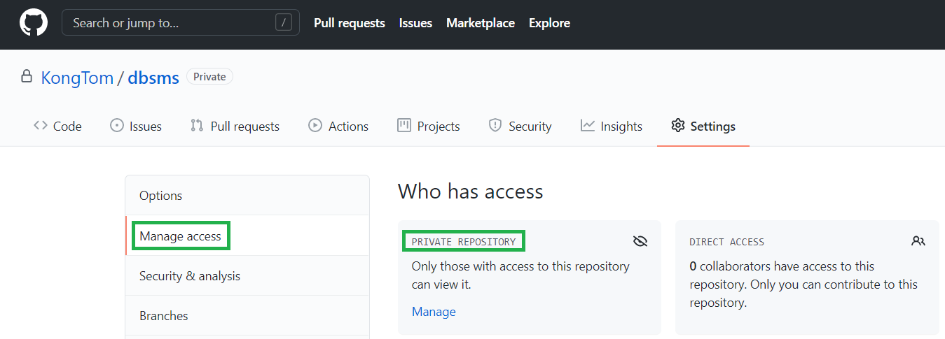 Private로 접근 권한이 설정된 것을 확인하는 방법은 'Manage access' 메뉴로 진입하여 PRIVATE REPOSITORY로 설정되어있는지를 확인하면 됩니다.