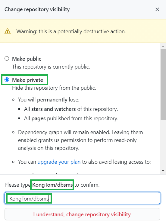 그리고 뜨는 창에서 'Make private' 옆을 체크합니다. 그리고 확인했다는 의미로 Typing 하라는 문구를 처넣고, 확인 버튼을 눌러줍니다.