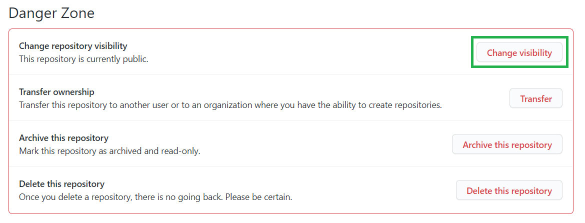 가장 아래에 Danger Zone이라는 영역이 있습니다. 이 중에서 'Change visibility'를 클릭해줍니다.