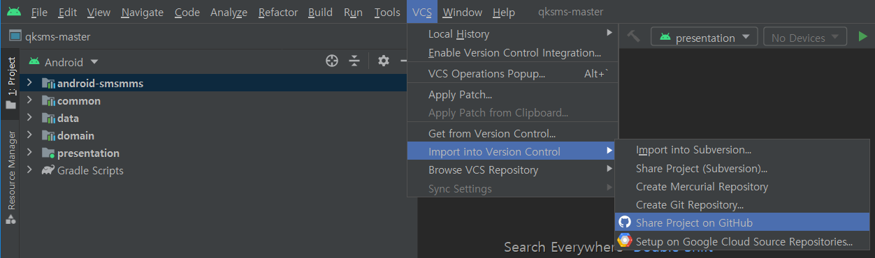 신규 앱 개발을 위해서 프로젝트를 Android studio에서 Github로 프로젝트를 바로 공유(VCS - Import into Version Control -> Share Project on GitHub) 하니 프로젝트가 공개로 업로드되었습니다.