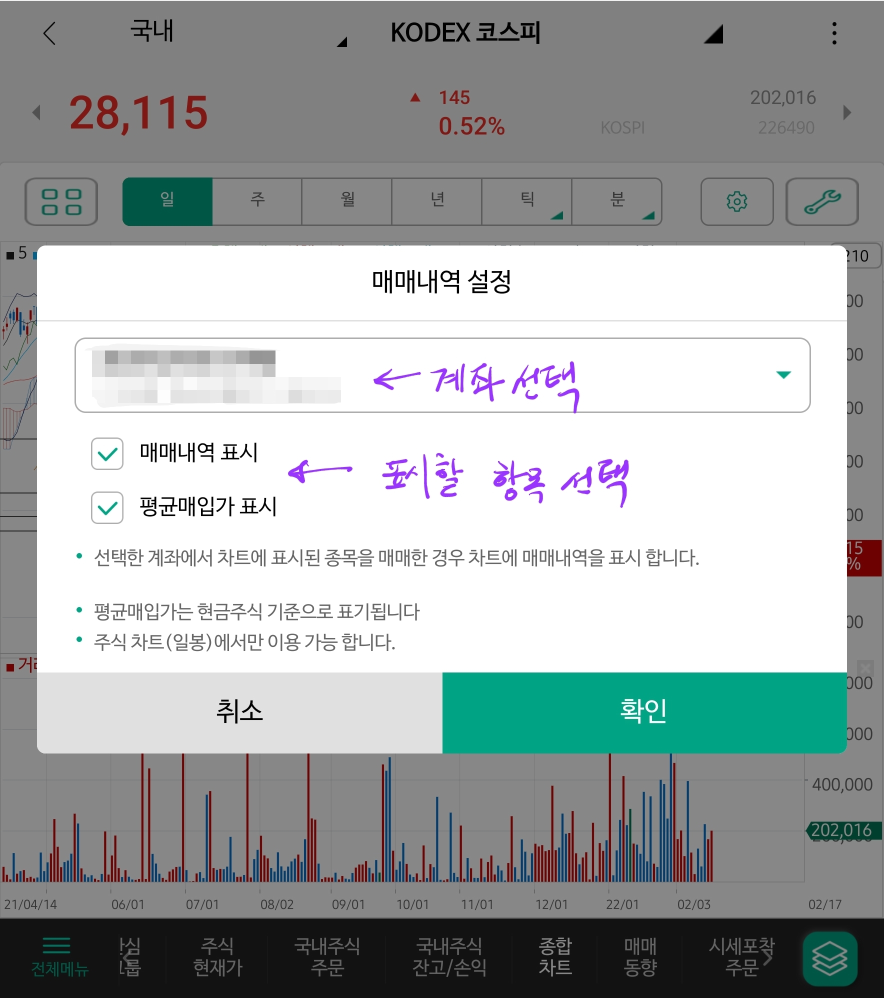 어떤 계좌의 매매내역을 표시해줄지 먼저 선택해 줍니다. 그리고 '매매내역 표시'와 '평균매입가 표시' 중 차트에 표기하길 원하는 항목들을 선택해주세요. 저는 두 가지 모두 선택했습니다. 마지막으로 확인 버튼을 눌러줍니다.