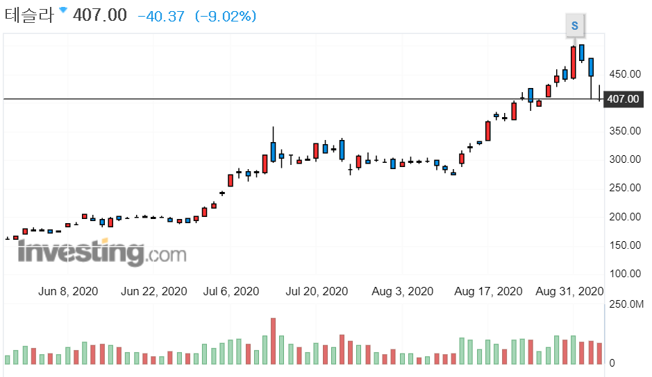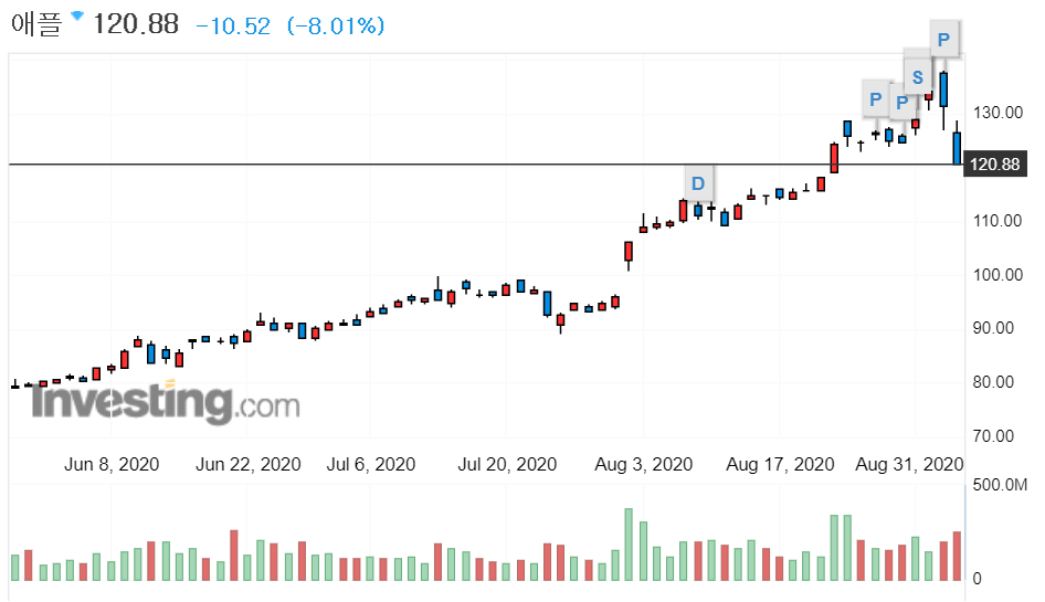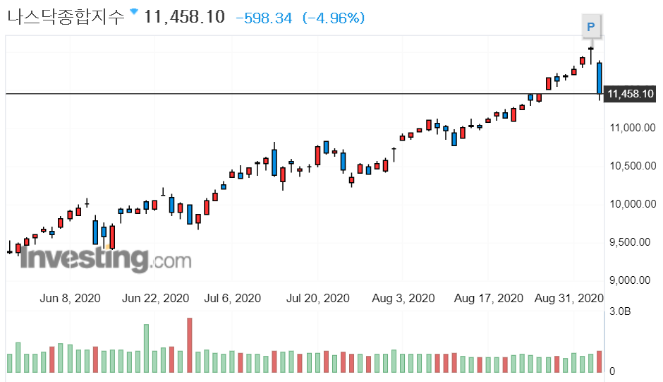 최근 큰 상승을 연이어오던 테슬라와 애플 같은 기술주들의 급락으로 인해 나스닥 종합지수도 급락했다. 테슬라의 경우 하루 -9.02%의 하락폭을 보였고, 애플은 -8.01%의 하락을 보였다.