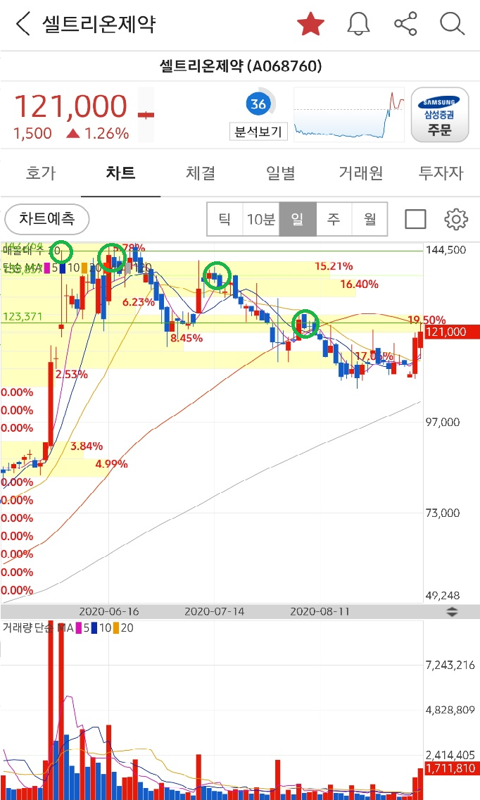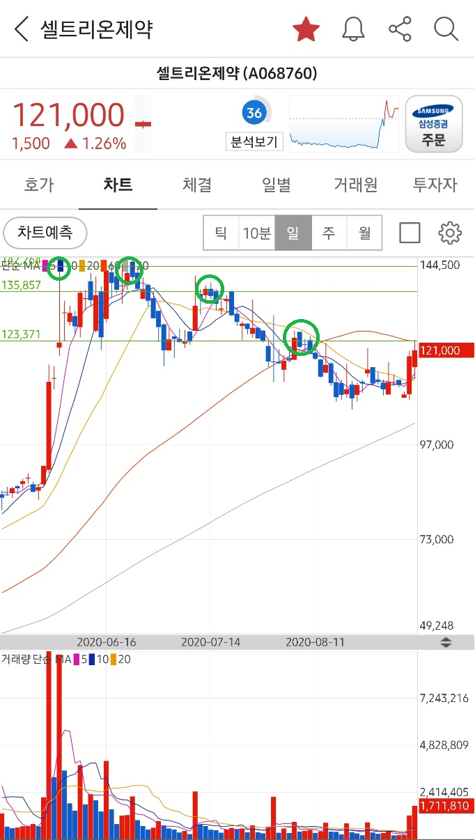 아래 셀트리온제약의 예시를 들어보자. 초록색 원을 그린 부분이 셀트리온 제약의 전고점이다. 현재의 가격 121,000원 보다 높은 과거의 꼭짓점 부분들이다.