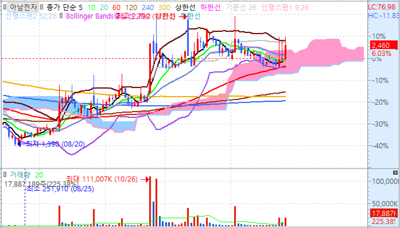 주식을 배우기 시작한 분들이라면 차트에 여러 보조 지표들을 추가해 놓을 것이다. 인터넷 상에서 가장 처음 접하기 쉬운 것이 보조지표에 대한 내용이다. 대표적으로 일목균형표, 볼린저밴드, 이동평균선이 있을 것이다. 설정을 해놓고 보면 아래와 같은 차트가 나타날 것이다.